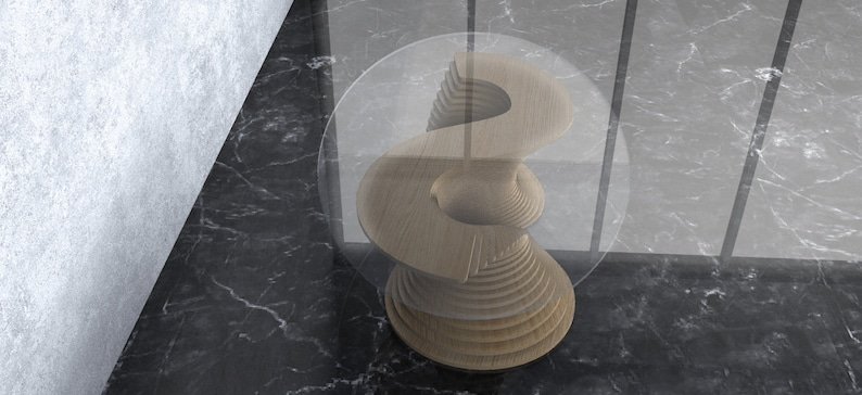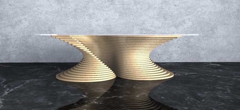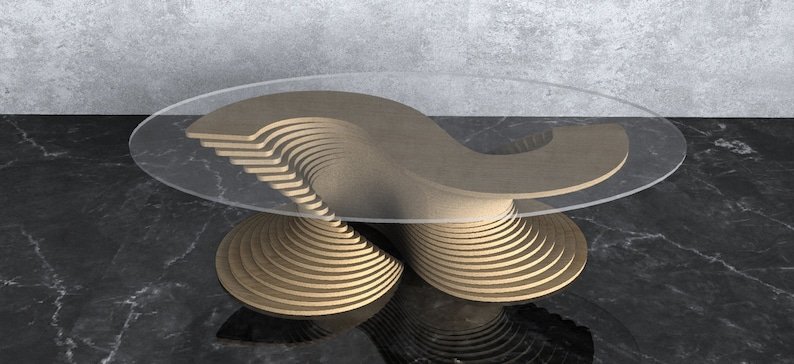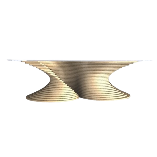 CNC-cut layered profiles form the flowing base structure. The tempered glass top enhances contrast while revealing the geometry beneath. Engineered for balance, durability, and long-term performance.