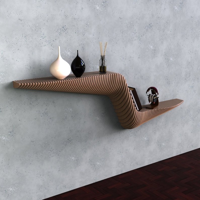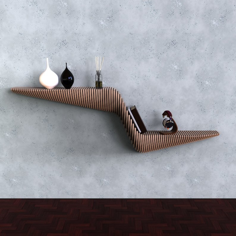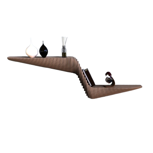 Designed with a sharp central transition, the shelf forms two horizontal display levels connected by a vertical drop. The stacked layers emphasize geometry while maintaining structural stability for books, decor, or media accessories.